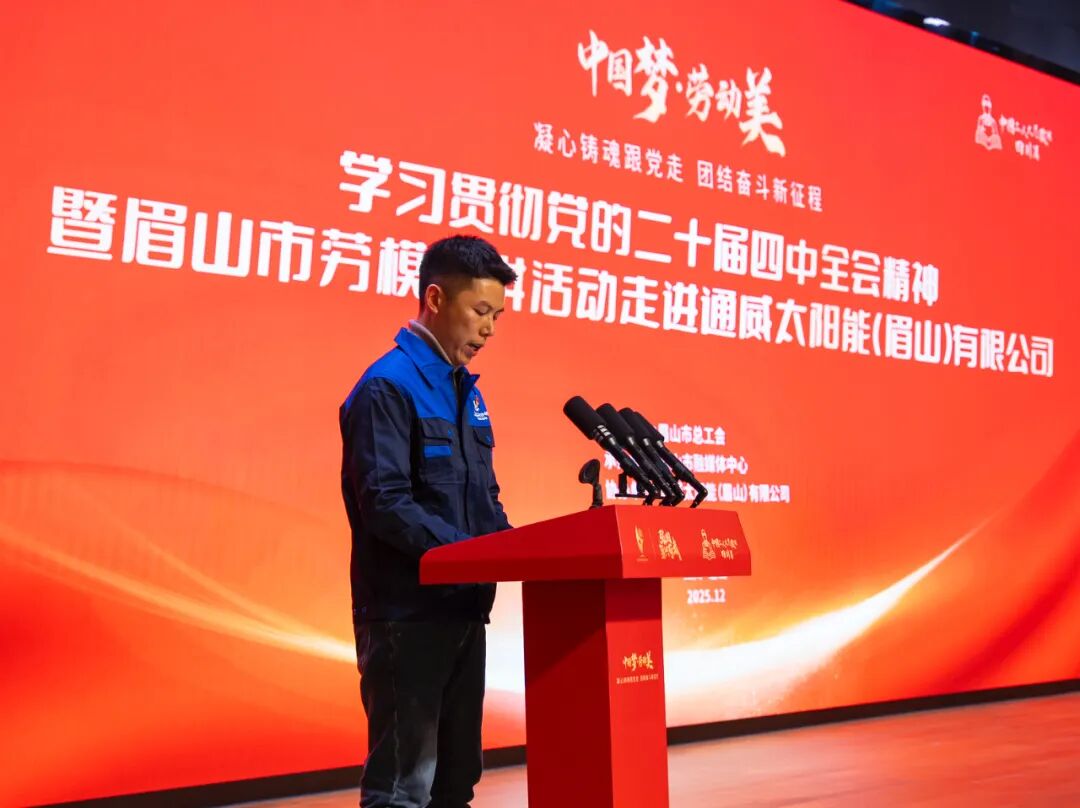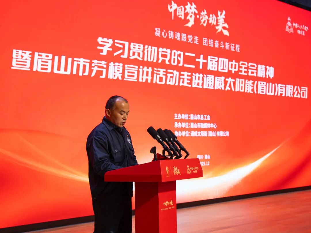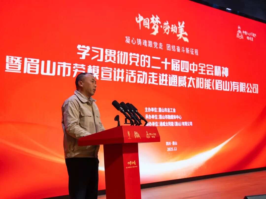 为深入学习宣传贯彻党的二十届四中全会、省委十二届八次全会精神,大力弘扬劳模精神、劳动精神、工匠精神,12月12日下午,由眉山市总工会主办的“‘中国梦・劳动美 凝心铸魂跟党走 团结奋斗新征程’学习贯彻党的二十届四中全会精神暨眉山市劳模宣讲活动”在通威太阳能(眉山)有限公司成功举行。活动旨在以劳模故事为载体,深化职工思想政治引领,团结动员广大职工为谱写眉山高质量发展新篇章贡献智慧和力量。