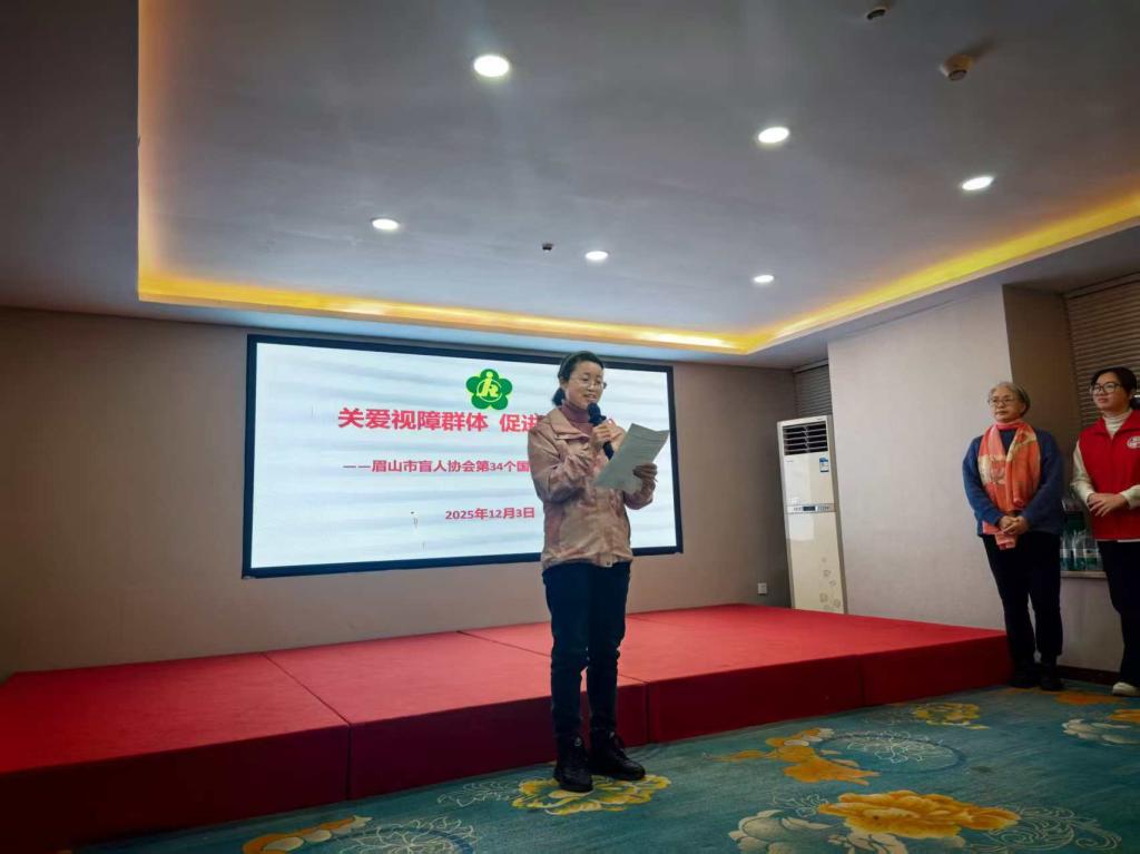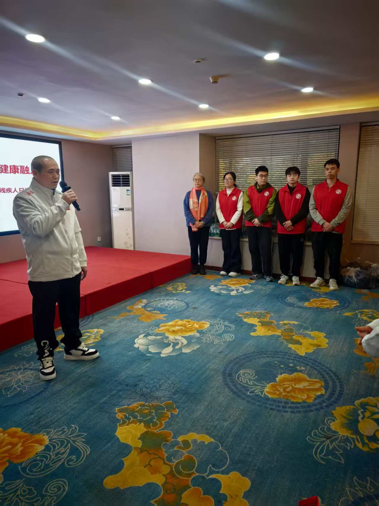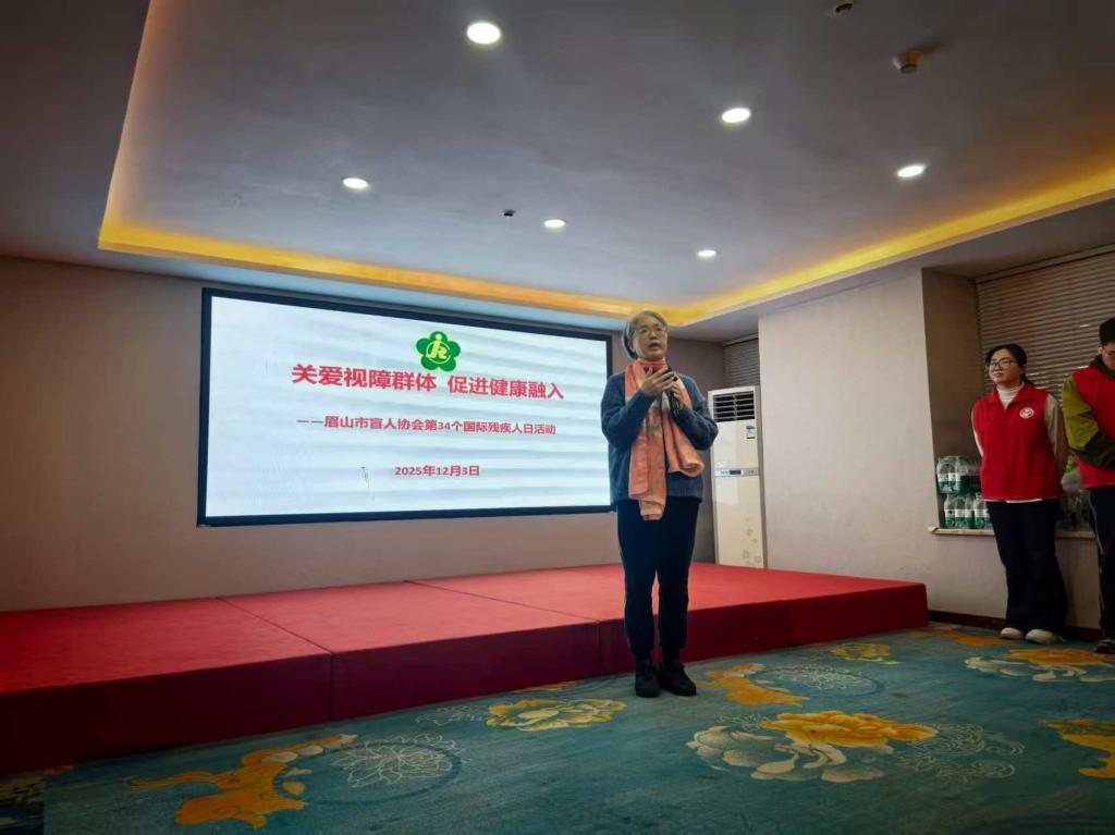 12月3日,为了庆祝第34个国际残疾人日,眉山市盲协举办以“关爱视障群体,促进健康融入”为主题的学习健身气功太极八段锦活动,来自全市的视障朋友及家属代表、助残志愿者及工作人员等近80余人参加活动。受市残联领导委托,组联负责人彭川出席活动并致辞;市盲协副主席陈刚代表市盲协作动员讲话;学员代表李佳作表态发言;成都体育学院副教授沈华指导组织开展教学练习。