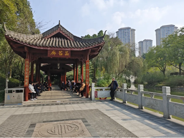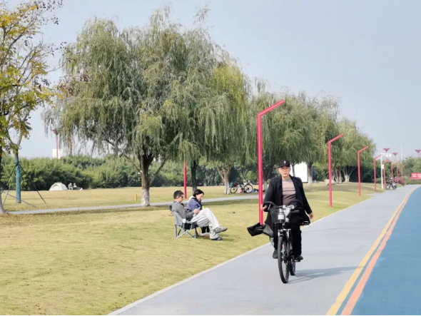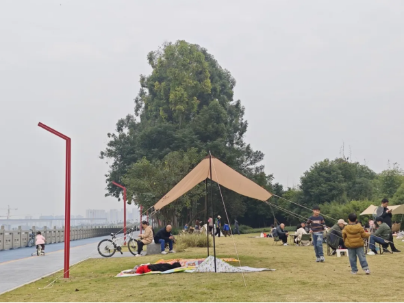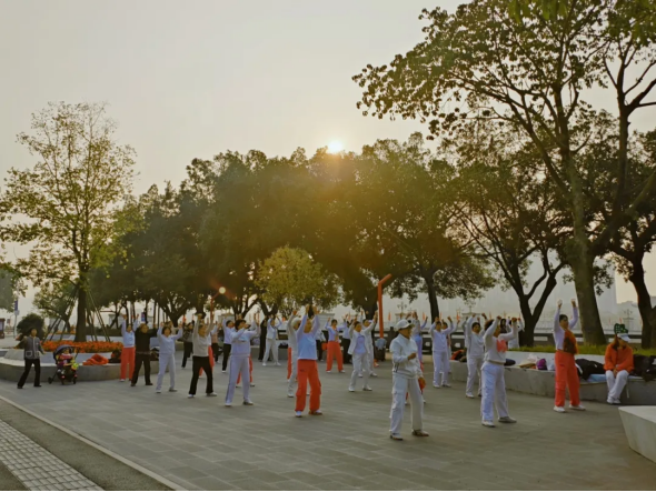 老人们沿着长堤缓缓骑行 手中的收音机飘出婉转的戏曲唱段 三五好友在此相聚 一边分享茶点、一边闲话家常