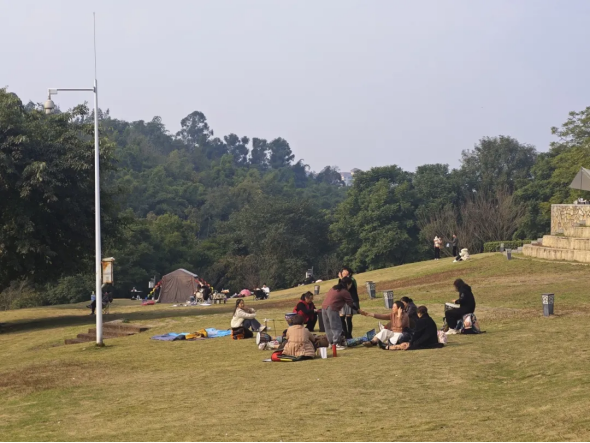 人们散坐其间 孩子追逐泡泡 年轻人野餐聊天