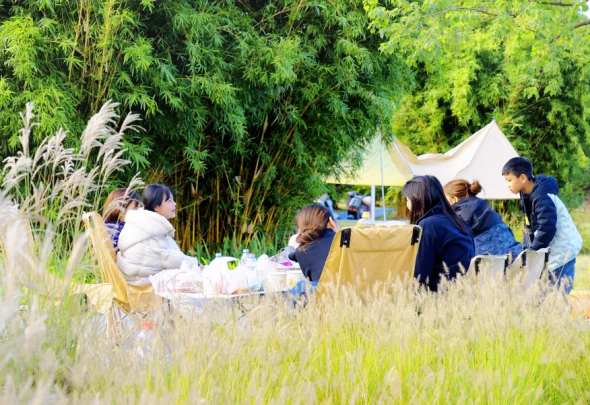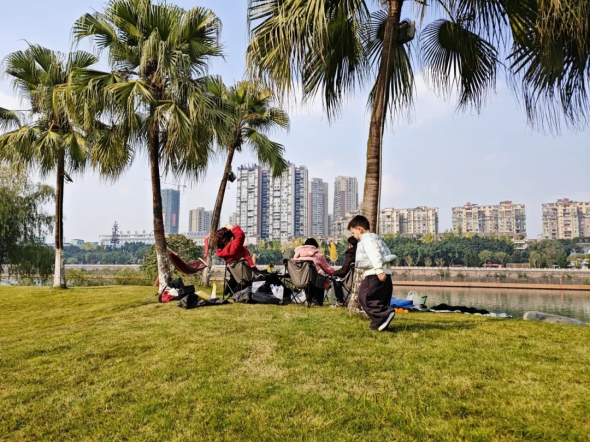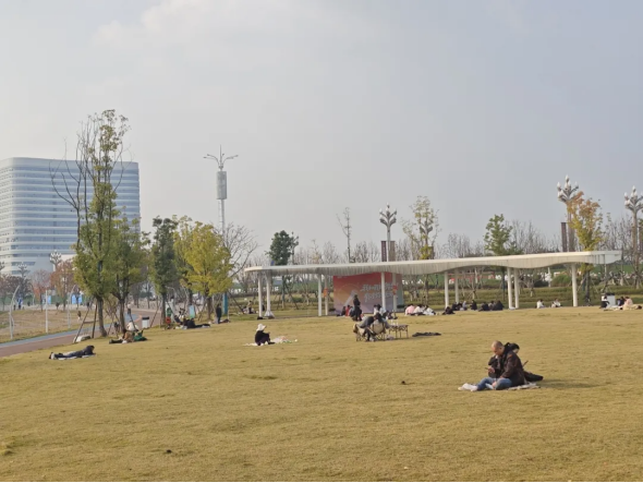 读者在斑驳光影中沉浸字里行间 孩童的欢笑声从游乐场里荡漾开来 与乒乓球台的清脆击球声交织成趣 年轻的父母铺开野餐垫 在草坪上或躺或坐 任由阳光温柔地洒满全身 在这里 人们或是在游乐中释放活力 或是在阳光下静享慵懒 以自己的方式享受着这份冬日馈赠 步入长廊 仿佛穿越一条翠色甬道