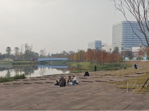 走进滨江公园 开阔草坪像巨幅金色地毯