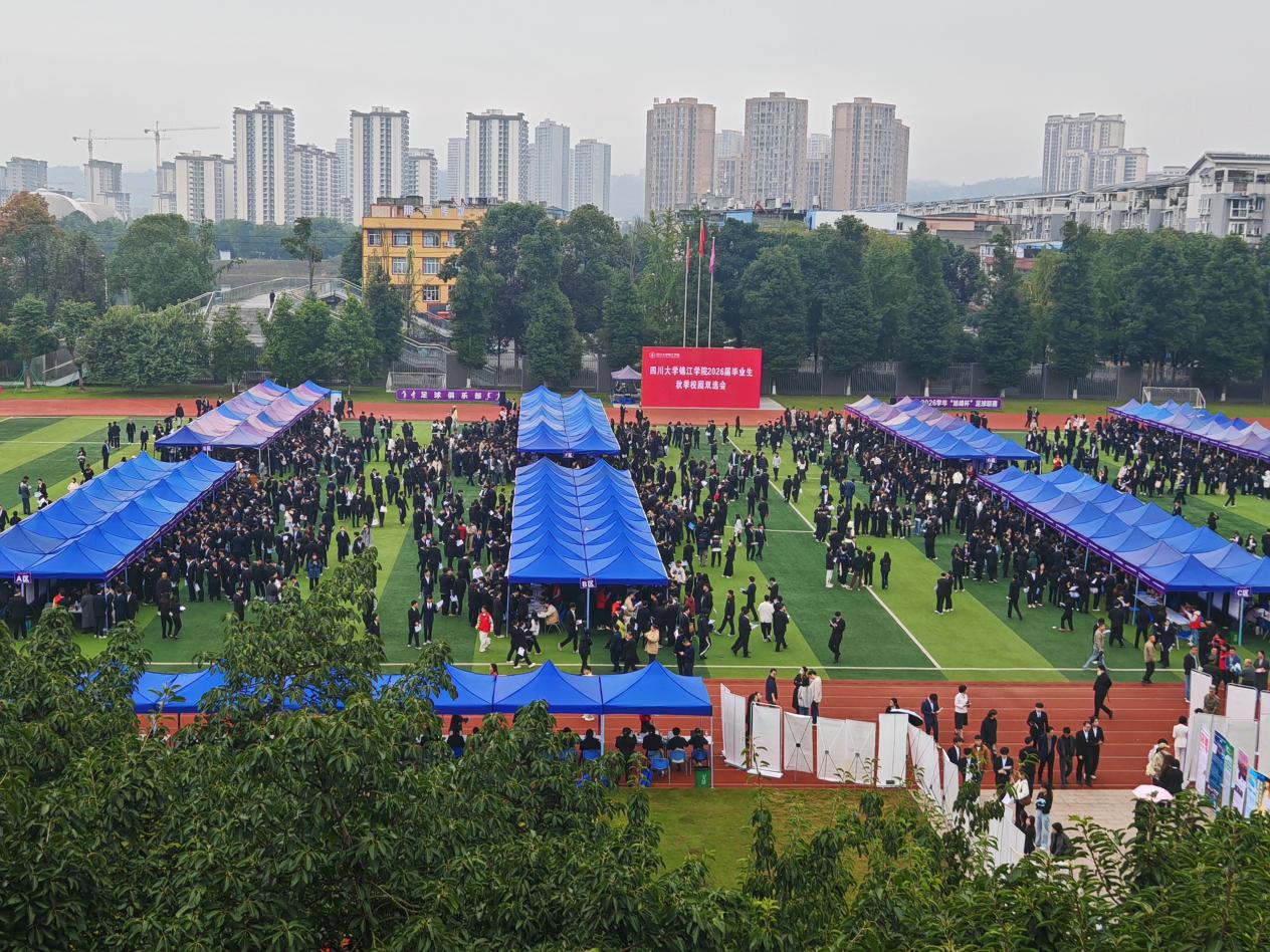 10月29日开展的2026届毕业生秋季校园双选会,来自成都西菱动力科技股份有限公司、重庆市大正仪表股份有限公司、四川省第三建筑工程有限公司、泸州老窖特曲酒类销售股份有限公司等全国的315家企事业单位携6400余个就业岗位进校招聘,现场各用人单位展位前人头攒动,交流踊跃,5000余名毕业生凭借扎实的专业能力和清晰的职业规划,当场与心仪单位达成就业或实习意向。