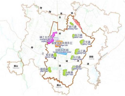 “一城”,即创新科技城,现更名为成都科学城。围绕具有4500余亩水面的兴隆湖而建,地铁1号线直达,临水而居、依水而行成为这一区域的特色生活方式。“一区”,即秦皇寺中央商务区,现更名为天府商务区。该区以“城市新中心、发展新高地”为发展定位,打造以总部经济、会展会议、商业商务和酒店服务为重点,具有现代都市功能的现代化、国际化和高端化的中央商务区。是整个天府新区的核心,未来成都依托这里形成“一核双中心”的城市格局。“一带”,也就是锦江生态带。通过实施锦江综合治理工程,将原河面疏浚拓宽至160-200米,打造融防洪、生态、休闲于一体的都市生态带。