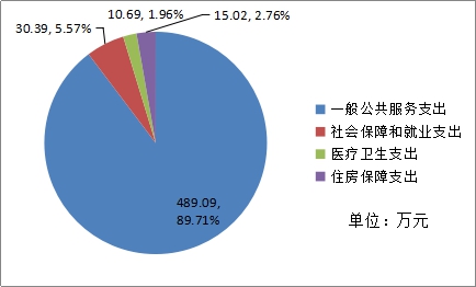 图5:一般公共预算财政拨款支出决算变动情况 (二)一般公共预算财政拨款支出决算结构情况 2018年一般公共预算财政拨款支出545.20万元,主要用于以下方面:一般公共服务支出(类)489.09万元,占89.71%;社会保障和就业支出(类)30.39万元,占5.57%;医疗卫生支出(类)10.69万元,占1.96%;住房保障支出(类)15.02万元,占2.75%。