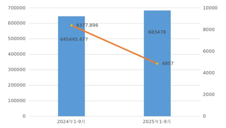 (二)货运周转量完成情况。2025年1—9月,货物周转量累计683478万吨公里,同比增长5.89%。