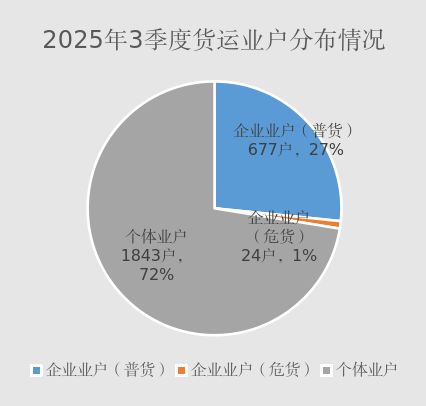 (一)道路货运业户情况。截至2025年9月底,全市共有货运业户2544户(含无车户)。其中普通货运677户,同比增加22户;危险货物运输企业24户,与2024年同期保持一致;个体业户数为1843户,同比下降122户;规上货运企业23户,同比增加5户。