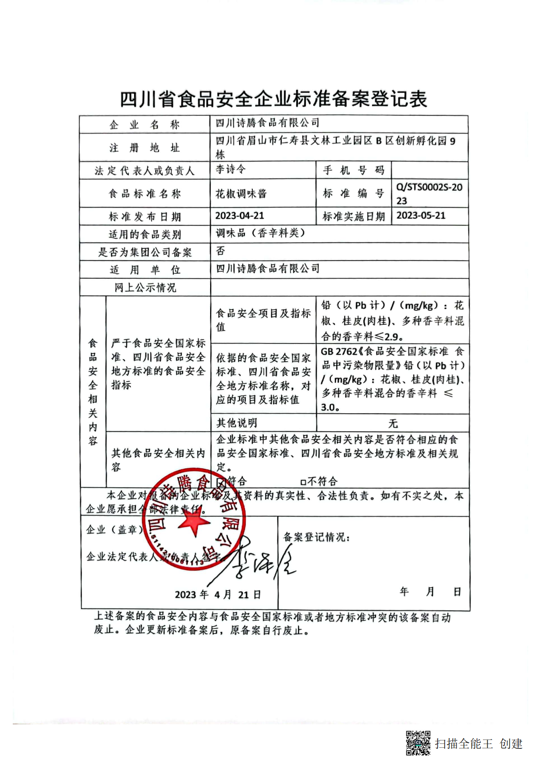四川诗腾食品有限公司-花椒调味酱(公示截止期2023.6.6)