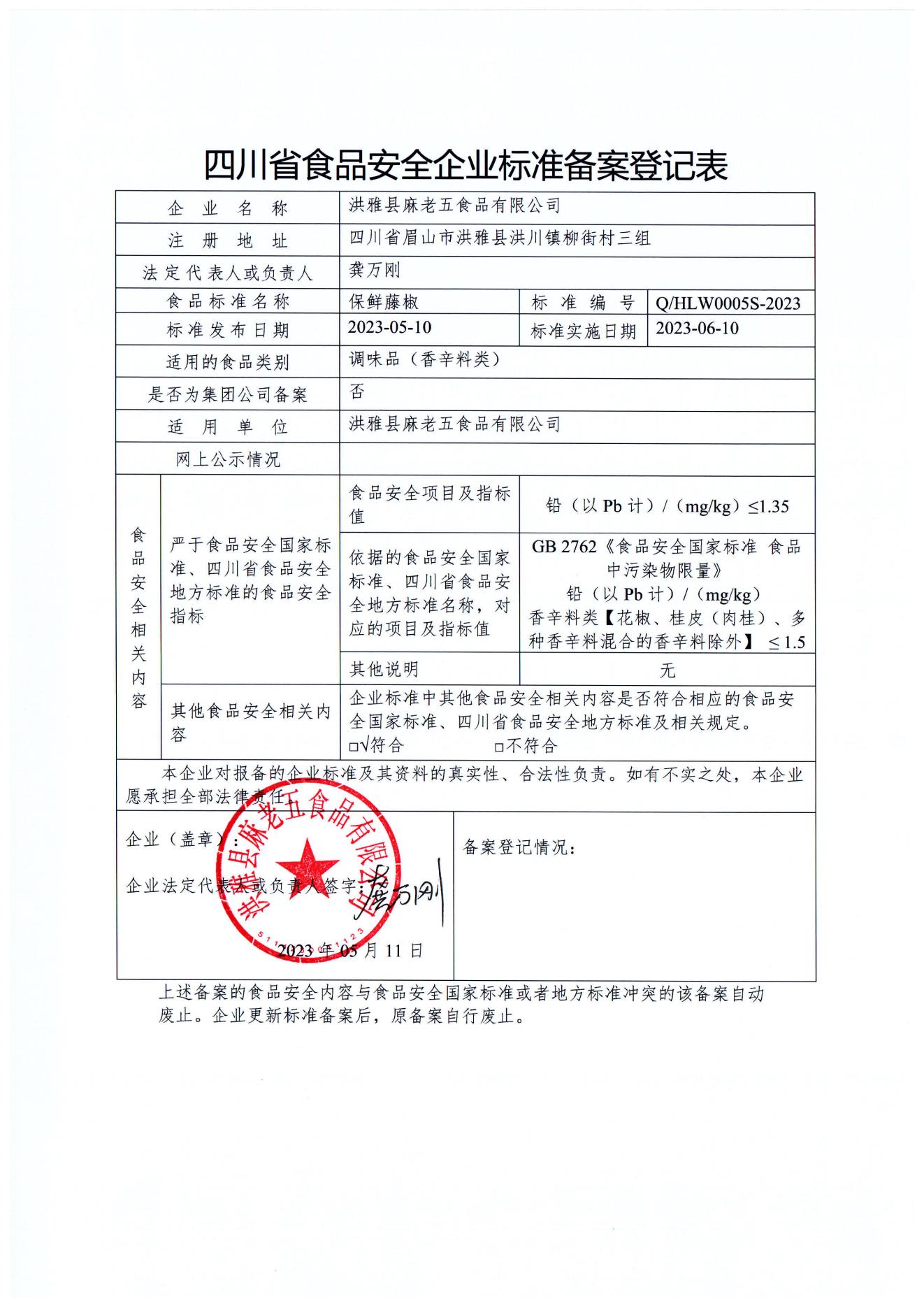 洪雅县麻老五食品有限公司-保鲜藤椒(公示截止期2023.6.12)