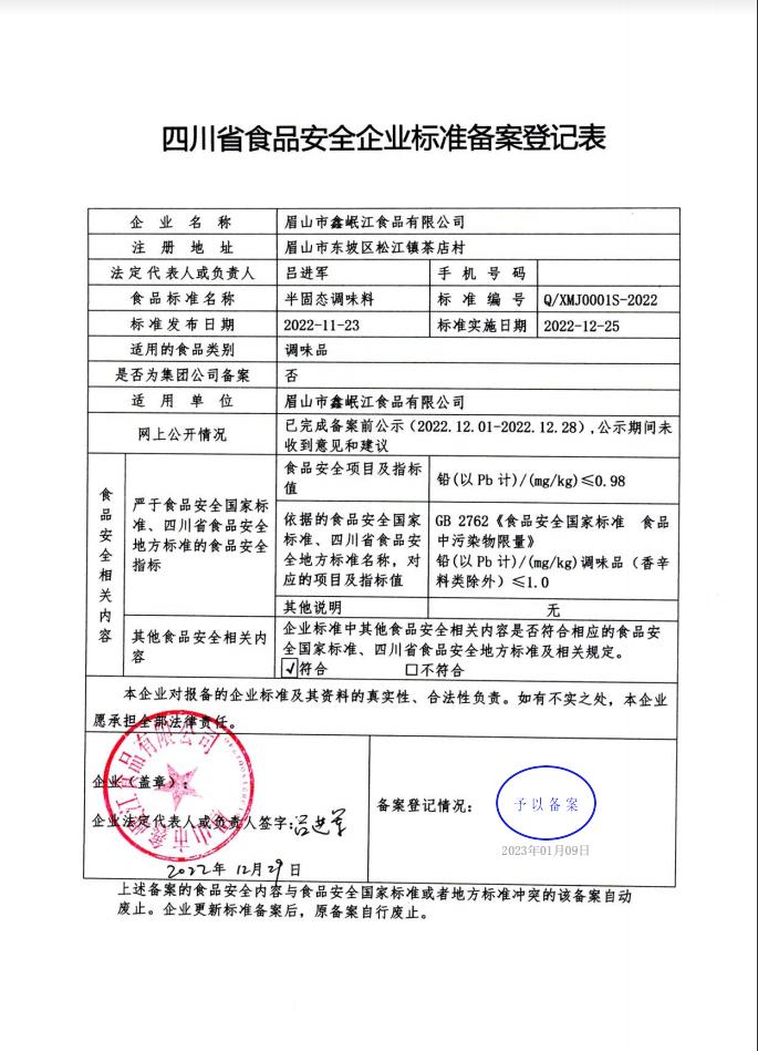 眉山市鑫岷江食品有限公司-半固态调味料登记表