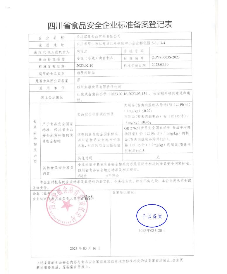 四川家蕴食品有限责任公司-冷冻(冷藏)禽畜制品