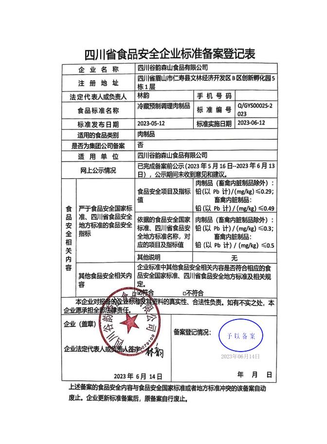 四川谷韵森山食品有限公司-冷藏预制调理肉制品