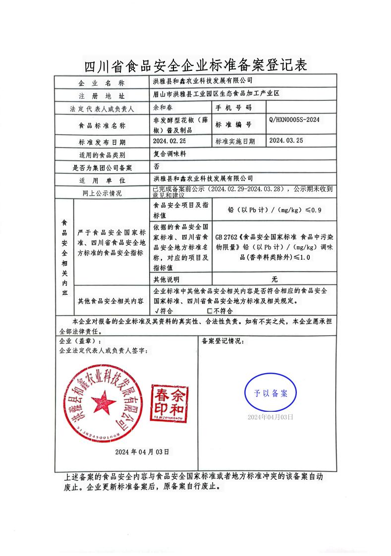 洪雅县和鑫农业科技发展有限公司--非发酵型花椒(藤椒)酱及制品