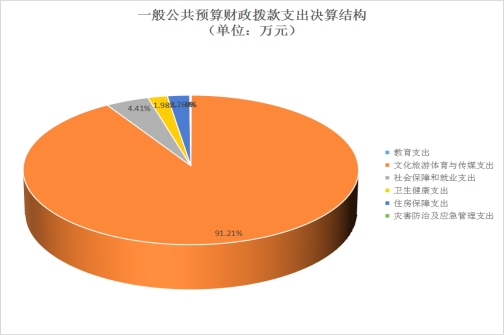 (图5:一般公共预算财政拨款支出决算变动情况) 2020年一般公共预算财政拨款支出4476.43万元,主要用于以下方面:教育(类)支出1.5万元,占0.03%;文化旅游体育与传媒(类)支出4,083.02万元,占91.21%;社会保障和就业(类)支出197.19万元,占4.41%;卫生健康(类)支出88.46万元,占1.98%;住房保障(类)支出101.11万元,占2.26%;灾害防治及应急管理(类)支出5.15万元,占0.12%。