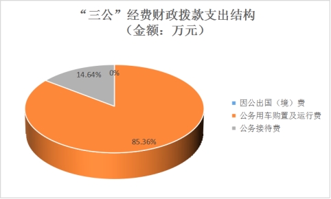 (图6:一般公共预算财政拨款支出决算结构) 2020年一般公共预算支出决算数为4476.43万元,完成预算100%。其中: 1.教育支出(类)进修及培训(款)其他进修及培训(项):支出决算为1.5万元,完成预算100%。 2.文化旅游体育与传媒支出(类)文化和旅游(款)行政运行(项):支出决算为1180.85万元,完成预算100%。 3.文化旅游体育与传媒支出(类)文化和旅游(款)一般行政管理事务(项):支出决算为86.1万元,完成预算100%。 4.文化旅游体育与传媒支出(类)文化和旅游(款)图书馆(项):支出决算为319.34万元,完成预算100%。 5.文化旅游体育与传媒支出(类)文化和旅游(款)文化活动(项):支出决算为38.57万元,完成预算100%。 6.文化旅游体育与传媒支出(类)文化和旅游(款)群众文化(项):支出决算为137.51万元,完成预算100%。 7.文化旅游体育与传媒支出(类)文化和旅游(款)文化创作与保护(项):支出决算为60.68万元,完成预算100%。 8.文化旅游体育与传媒支出(类)文化和旅游(款)文化和旅游市场管理(项):支出决算为51.28万元,完成预算100%。 9.文化旅游体育与传媒支出(类)文化和旅游(款)文旅游宣传(项):支出决算为531.76万元,完成预算100%。 10.文化旅游体育与传媒支出(类)文化和旅游(款)文化和旅游管理事务(项):支出决算为86.83万元,完成预算100%。 11.文化旅游体育与传媒支出(类)文化和旅游(款)其他文化和旅游支出(项):支出决算为807.75万元,完成预算100%。 12.文化旅游体育与传媒支出(类)文物(款)文物保护(项):支出决算为35.51万元,完成预算100%。 13.文化旅游体育与传媒支出(类)文物(款)其他文物支出(项):支出决算为12.37万元,完成预算100%。 14.文化旅游体育与传媒支出(类)广播电视(款)行政运行(项):支出决算为298.97万元,完成预算100%。 15.文化旅游体育与传媒支出(类)广播电视(款)一般行政管理事务(项):支出决算为6.1万元,完成预算100%。 16.文化旅游体育与传媒支出(类)广播电视(款)广播(项):支出决算为71.13万元,完成预算100%。 17.文化旅游体育与传媒支出(类)广播电视(款)电视(项):支出决算为7.4万元,完成预算100%。 18.文化旅游体育与传媒支出(类)广播电视(款)其他广播电视支出(项):支出决算为338.87万元,完成预算100%。 19.文化旅游体育与传媒支出(类)其他文化旅游体育与传媒支出(款)文化产业发展专项支出(项):支出决算为11万元,完成预算100%。 20.文化旅游体育与传媒支出(类)其他文化旅游体育与传媒支出(款)其他文化旅游体育与传媒支出(项):支出决算为1万元,完成预算100%。 21.社会保障和就业支出(类)行政事业单位养老支出(款)机关事业单位基本养老保险缴费支出(项):支出决算为134.81万元,完成预算100%。 22.社会保障和就业支出(类)行政事业单位养老支出(款)机关事业单位基本养老保险缴费支出(项):支出决算为62.38万元,完成预算100%。 23.卫生健康支出(类)行政事业单位医疗(款)行政单位医疗(项):支出决算为46.04万元,完成预算100%。 24.卫生健康支出(类)行政事业单位医疗(款)行政单位医疗(项):支出决算为42.42万元,完成预算100%。 25.住房保障支出(类)住房改革支出(款)住房公积金(项):支出决算为101.11万元,完成预算100%。 26.灾害防治及应急管理支出(类)应急管理事务(款)安全监管(项):支出决算为5.15万元,完成预算100%。 2020年一般公共预算财政拨款基本支出2,176.31万元,其中: 人员经费1,843.11万元,主要包括:基本工资、津贴补贴、奖金、伙食补助费、绩效工资、机关事业单位基本养老保险缴费、职业年金缴费、职工基本医疗保险缴费、公务员医疗补助缴费、其他社会保障缴费、住房公积金、其他工资福利支出。 日常公用经费333.2万元,主要包括:办公费、印刷费、咨询费、水费、电费、邮电费、物业管理费、差旅费、维修(护)费、会议费、培训费、公务接待费、劳务费、委托业务费、工会经费、福利费、公务用车运行维护费、其他交通费、其他商品和服务支出。 2020年“三公”经费财政拨款支出决算为17.55万元,完成预算100%,决算数小于预算数的主要原因是厉行节约,减少公务接待,接待费减少;受疫情影响,因公出国(境)费用减少。 2020年“三公”经费财政拨款支出决算中,因公出国(境)费支出决算0万元,占0%;公务用车购置及运行维护费支出决算14.98万元,占85.36%;公务接待费支出决算2.57万元,占14.64%。具体情况如下:
