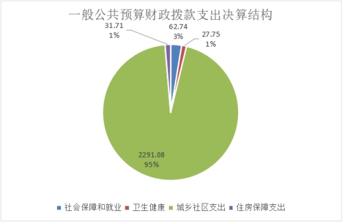(图5:一般公共预算财政拨款支出决算变动情况)(柱状图) (二)一般公共预算财政拨款支出决算结构情况 2020年一般公共预算财政拨款支出2413.28万元,主要用于以下方面:社会保障和就业支出(类)支出62.74万元,占3%;卫生健康支出(类)27.75万元,占1%;城乡社区支出(类)支出2291.08万元,占95%;住房保障支出(类)支出31.71万元,占1%。
