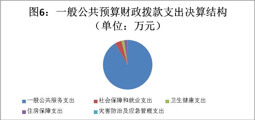 (二)一般公共预算财政拨款支出决算结构情况 2020年一般公共预算财政拨款支出4222.38万元,主要用于以下方面:一般公共服务(类)支出3869.73万元,占91.65%;教育支出(类)0万元;科学技术(类)支出0万元;文化旅游体育与传媒(类)支出0万元;社会保障和就业(类)支出178.34万元,占4.22%;卫生健康支出79.01万元,占1.87%;住房保障支出90.3万元,占2.14%;灾害防治及应急管理支出5万元,占0.12%。