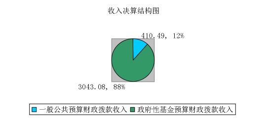 2021年本年收入合计3453.57万元,其中:一般公共预算财政拨款收入410.49万元,占12%;政府性基金预算财政拨款收入3043.08万元,占88%;国有资本经营预算财政拨款收入0万元,占0%;上级补助收入0万元,占0%;事业收入0万元,占0%;经营收入0万元,占0%;附属单位上缴收入0万元,占0%;其他收入0万元,占0%。 (图2:收入决算结构图)(饼状图)