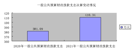 2021年一般公共预算财政拨款支出410.34万元,占本年支出合计的12%。与2020年相比,一般公共预算财政拨款支出增加29.25万元,增长7%。 (图5:一般公共预算财政拨款支出决算变动情况)(柱状图)