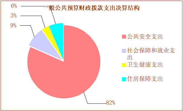 (二)一般公共预算财政拨款支出决算结构情况 2024年度一般公共预算财政拨款支出4400.45万元,主要用于以下方面:公共安全支出3590.71万元,占81.6%;社会保障和就业支出386.01万元,占8.77%;卫生健康支出140.96万元,占3.2%;住房保障支出282.77万元,占6.43%。 (图6:一般公共预算财政拨款支出决算结构)(饼状图)