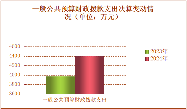 五、一般公共预算财政拨款支出决算情况说明 (一)一般公共预算财政拨款支出决算总体情况 2024年度一般公共预算财政拨款支出4400.45万元,占本年支出合计的75.1%。与2023年度相比,一般公共预算财政拨款支出增加426.34万元,增长10.73%。主要变动原因是人员经费增加。 (图5:一般公共预算财政拨款支出决算变动情况)(柱状图)