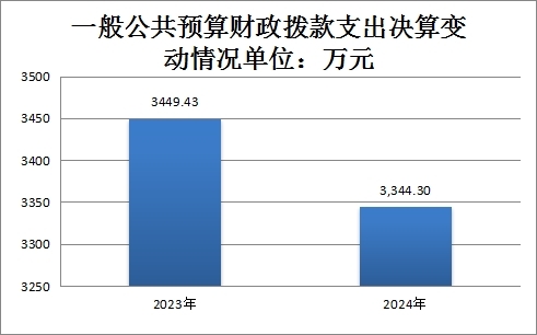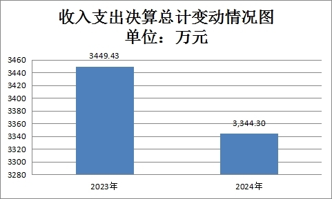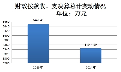 四、财政拨款收入支出决算总体情况说明 2024年度财政拨款收、支总计均为3344.3万元。与2023年度相比,财政拨款收、支总计各减少105.13万元,减少3.05%。主要变动原因是2024年在职人员退休,基本支出减少。 (注:数据来源于财决01-1表) 五、一般公共预算财政拨款支出决算情况说明 (一)一般公共预算财政拨款支出决算总体情况 2024年度一般公共预算财政拨款支出3344.3万元,占本年支出合计的100%。与2023年度相比,一般公共预算财政拨款支出减少105.13万元,减少3.05%。主要变动原因是2024年在职人员退休,基本支出减少。
