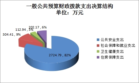 (二)一般公共预算财政拨款支出决算结构情况 2024年度一般公共预算财政拨款支出3344.3万元,主要用于以下方面: 公共安全支出2724.79万元,占82%;社会保障和就业支出304.41万元,占9%;卫生健康支出112.94万元,占3%;住房保障支出202.17万元,占6%。 (注:数据来源于财决01-1表,仅罗列本部门涉及的全部功能分类科目,至类级。)