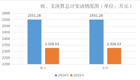 一、收入支出决算总体情况说明 2024年度收入、支出总计均为2328.53万元。与2023年度相比,收入、支出总计各减少222.75万元,下降8.73%。主要变动原因是项目减少,项目支出减少。