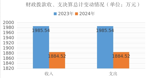 三、支出决算情况说明 2024年度本年支出合计2328.53万元,其中:基本支出1548.37万元,占66.5%;项目支出780.16万元,占33.5%;上缴上级支出0万元,占0%;经营支出0万元,占0%;对附属单位补助支出0万元,占0%。 四、财政拨款收入支出决算总体情况说明 2024年度财政拨款收入、支出总计均为1884.52万元。与2023年度相比,财政拨款收入总计、支出总计各减少101.02万元,下降5.09%。主要变动原因是厉行节约。 五、一般公共预算财政拨款支出决算情况说明 (一)一般公共预算财政拨款支出决算总体情况 2024年度一般公共预算财政拨款支出1884.52万元,占本年支出合计的80.93%。与2023年度相比,一般公共预算财政拨款支出减少101.02万元,下降5.09%。主要变动原因是厉行节约。