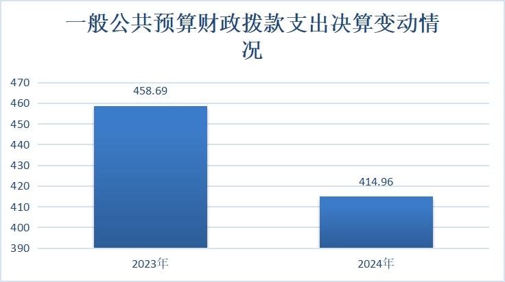 2024年度一般公共预算财政拨款支出414.96万元,占本年支出合计的100%。与2023年度相比,一般公共预算财政拨款支出减少43.73万元,下降9.53%。主要变动原因是2024年度人员减少,人员经费支出减少。
