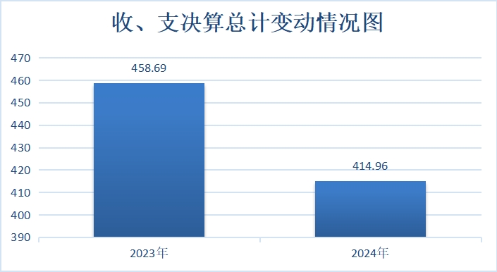 2024年度收入、支出总计均为414.96万元。与2023年度相比,收入、支出总计各减少43.73万元,下降9.53%。主要变动原因是2024年度人员减少,人员经费支出减少。