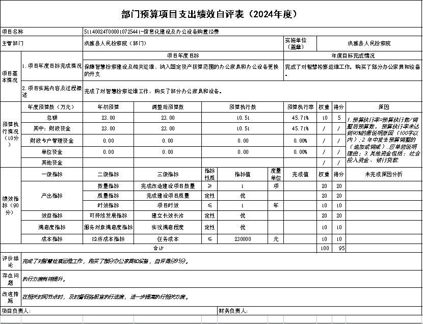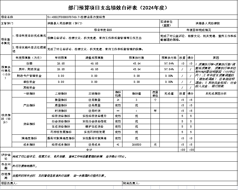 一、单位基本情况 (一)机构组成。洪雅县人民检察院属司法机关,为一级预算单位,院内共设置五个内设机构。 (二)机构职能。洪雅县人民检察院是国家的法律监督机关,主要任务是依法履行法律监督职能,保障国家法律的统一、正确实施。 (三)人员概况。截至2024年末,洪雅县人民检察院政法专项编制人数30人,工勤1人,其他人员10人。 二、单位资金收支情况 (一)收入情况。洪雅县人民检察院2024年年初预算收入1124.7万元,其中一般公共预算拨款收入1002.7万元,占比89.15%,其他收入122万元,占比10.85%;决算报表收入1095.78,其中一般公共预算拨款收入892.98万元,占比81.49%,其他收入202.8万元,占比18.51%。。 (二)支出情况。洪雅县人民检察院2024年年初预算支出1124.7万元,其中基本支出722.83万元,占比64.27%,项目支出401.87万元,占比35.73%;决算报表支出1095.78,其中基本支出862.44万元,占比78.71%,项目支出233.34万元,占比21.29%。 (三)结余分配和结转结余情况。洪雅县人民检察院2024年决算报表结转结余0万元。 三、单位预算绩效分析 (一)单位预算总体绩效分析。根据单位预算绩效评价指标体系“总体绩效”涉及二、三级指标进行逐项绩效分析并评分,依次包括履职效能、预算管理、财务管理、资产管理、采购管理等情况。 1.履职效能。创新建立“四同四赋”党建业务融合发展方法,工作经验在全市推广。严守政治纪律和政治规矩,向县委及县委政法委、市检察院请示报告重大事项18件次;深入推进“检察护企”专项行动,对侵害市场主体合法权益行为“零容忍”,依法办理涉企犯罪案件3件,帮助挽回损失40余万元;扎实推进“检护民生”专项行动,依法惩治群众关心的侵犯公民个人信息、网络赌博等犯罪47人,办理的付某某侵犯公民个人信息案入选全市政法系统典型案例;加强未成年人双向保护,严惩侵害未成年人犯罪3件4人,对轻微犯罪未成年人依法不诉10人,开展分级干预矫治7件次,联合多部门开展未成年被害人复学、心理疏导等综合救助。 2.预算管理。我院严格按要求编制年初单位预算,确保预算的合理性和可行性。支出执行进度全年无预警金额,无支出违规金额。预算年终结余0万元。“三公经费”、差旅费、办公设备购置等费用进行严格控制。 3.财务管理。我院已制定内部财务管理制度等制度机制,合理设置财务工作岗位,明确职责权限,并严格实行不相容岗位分离,资金使用符合相关财务管理规定。 4.资产管理。我院实行资产分类管理,建立健全资产管理的相关制度。我院2024年人均资产变化率小于市直行政事业单位人均资产变化率、人均资产增长率小于同期市级财政收入增长率。 5.采购管理。我院严格执行促进中小企业发展相关管理办法,对适宜由中小企业提供的采购项目和采购包,预留采购份额专门面向中小企业采购。 (二)单位预算项目绩效分析。 我院无常年项目。 阶段(一次性)项目绩效分析。该类项目总数13个,涉及预算总金额1002.7万元,1—12月预算执行总体进度为89.06%,其中:预算结余率大于10%的项目共计0个。 1.项目决策。我院预算项目设立已按规定履行评估论证、申报程序;预算项目绩效目标与计划期内的任务量、预算安排的资金量相匹配,绩效目标设置科学合理、规范完整、量化细化、预算匹配;预算项目均在规定时间完成项目入库。 2.项目执行。我院预算项目实际列支内容与绩效目标设置方向相符,预算项目已采用收回预算、调整目标等调整措施。 3.目标实现。我院预算项目目标全部完成,无目标偏离情况,目标效益指标实施情况较好。 (三)绩效结果应用情况。本院绩效管理情况严格按照政府信息公开要求,将绩效评价结果进行公开,接受社会公众监督。 四、评价结论及建议 (一)评价结论。2024年我院高度重视财政资金使用情况,年初预算项目编制完备,年末决算数据准确,严格执行绩效管理有关规定,进一步规范了财政资金管理,提高了资金使用效率。最终自评得分为98.02分。 (二)存在问题。一是预算编制还需进一步细化,二是个别项目进展缓慢,导致资金项目未达到预期。 (三)改进建议。一是进一步细化阶段性预算编制,持续加强本院的预算管理意识,严格按照预算编制的相关制度和要求进行预算编制。二是进一步提高执行能力,在相关时间节点,及时督促各部门推进项目进程。三是加强财务管理和审核,健全财务管理制度体系,规范财务行为,进一步加强本院财务管理。