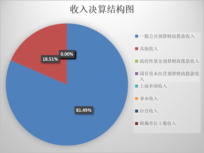 二、收入决算情况说明 2024年度本年收入合计1095.78万元,其中:一般公共预算财政拨款收入892.98万元,占81.49%;政府性基金预算财政拨款收入0万元,占0%;国有资本经营预算财政拨款收入0万元,占0%;上级补助收入0万元,占0%;事业收入0万元,占0%;经营收入0万元,占0%;附属单位上缴收入0万元,占0%;其他收入202.8万元,占18.51%。 (图2:收入决算结构图)