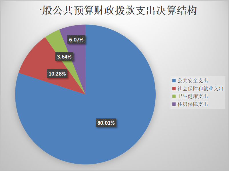 五、一般公共预算财政拨款支出决算情况说明 (一)一般公共预算财政拨款支出决算总体情况 2024年度一般公共预算财政拨款支出892.98万元,占本年支出合计的81.49%。与2023年度相比,一般公共预算财政拨款支出减少73.34万元,下降7.59%。主要变动原因是项目支出减少。 (图5:一般公共预算财政拨款支出决算变动情况) (二)一般公共预算财政拨款支出决算结构情况 2024年度一般公共预算财政拨款支出892.98万元,主要用于以下方面:公共安全支出714.48万元,占80.01%;社会保障和就业支出91.76万元,占10.28%;卫生健康支出32.54万元,占3.64%;住房保障支出54.19万元,占6.07%。 (图6:一般公共预算财政拨款支出决算结构) (三)一般公共预算财政拨款支出决算具体情况 2024年度一般公共预算财政拨款支出决算数为892.98万元,完成预算89.06%。其中: 1.公共安全支出(类)检察(款)行政运行(项):支出决算为481.15万元,完成预算104.26%,决算数大于预算数的主要原因是年中将部分资金调整为行政运行;公共安全支出(类)检察(款)一般行政管理事务(项):支出决算为104.81万元,完成预算51.98%,决算数小于预算数的主要原因是一般行政管理事务支出减少;公共安全支出(类)检察(款)其他检察支出(项):支出决算为28.86万元,完成预算74%,决算数小于预算数的主要原因是其他检察支出减少;公共安全支出(类)其他公共安全支出(款)其他公共安全支出(项):支出决算为99.67万元,完成预算92.10%,决算数小于预算数的主要原因是其他公共安全支出减少。 2.社会保障和就业支出(类)行政事业单位养老支出(款)机关事业单位基本养老保险缴费支出(项):支出决算为65.27万元,完成预算91.21%,决算数小于预算数的主要原因是保险比例调整;社会保障和就业支出(类)行政事业单位养老支出(款)机关事业单位职业年金缴费支出(项):支出决算为25.31万元,完成预算84.48%,决算数小于预算数的主要原因是年中进行调整;社会保障和就业支出(类)其他社会保障和就业支出(款)其他社会保障和就业支出(项):支出决算为1.19万元,完成预算93.70%,决算数小于预算数的主要原因是年中进行调整。 3.卫生健康支出(类)行政事业单位医疗(款)行政单位医疗(项):支出决算为26.24万元,完成预算72.21%,决算数小于预算数的主要原因是保险比例调整;卫生健康支出(类)行政事业单位医疗(款)公务员医疗补助(项):支出决算为6.30万元。 4.住房保障支出(类)住房改革支出(款)住房公积金(项):支出决算为54.19万元,完成预算101.80%,决算数大于预算数的主要原因是年中进行调整。