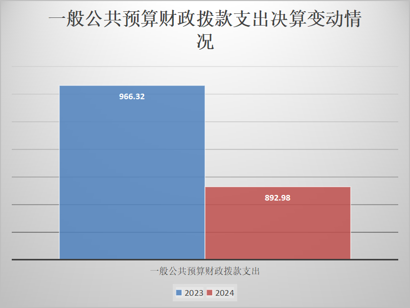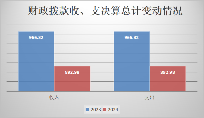 四、财政拨款收入支出决算总体情况说明 2024年度财政拨款收入、支出总计均为892.98万元。与2023年度相比,财政拨款收入总计、支出总计各减少73.34万元,下降7.59%。主要变动原因是项目支出减少。 (图4:财政拨款收、支决算总计变动情况)