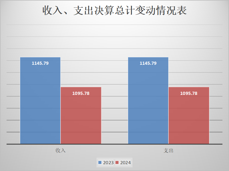 一、收入支出决算总体情况说明 2024年度收入、支出总计均为1095.78万元。与2023年度相比,收入支出总计各减少50.01万元,下降4.36%。主要变动原因是项目支出减少。 (图1:收入、支出决算总计变动情况图)