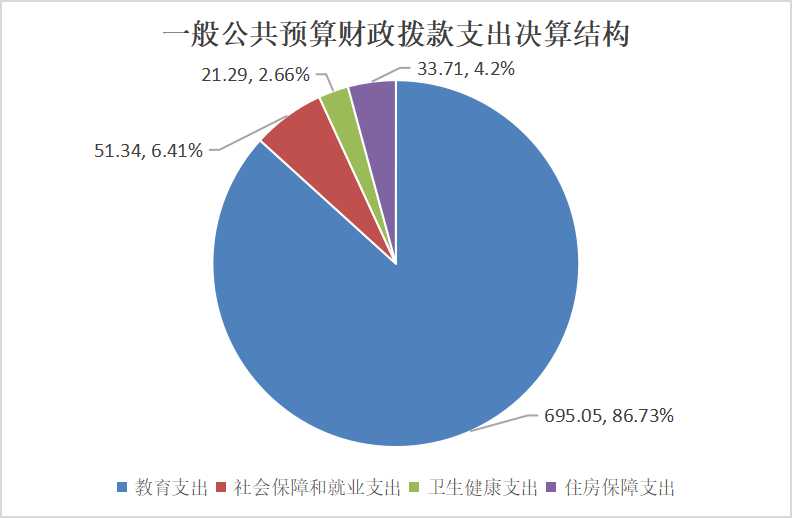 2024年度一般公共预算财政拨款支出801.38万元,主要用于以下方面:教育支出695.05万元,占86.73%;社会保障和就业支出51.34万元,占6.41%;卫生健康支出21.29万元,占2.66%;住房保障支出33.71万元,占4.20%。