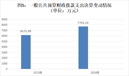 2024年度一般公共预算财政拨款支出7715.23万元,占本年支出合计的71.11%。与2023年度相比,一般公共预算财政拨款支出增加1543.84万元,增长25.02%。主要变动原因:根据工作部署和规范要求,相关运行经费纳入本级预算。