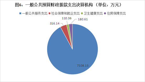 (二)一般公共预算财政拨款支出决算结构情况 2024年度一般公共预算财政拨款支出7715.23万元,主要用于以下方面:一般公共服务支出7108.13万元,占92.13%;教育支出0万元,占0%;科学技术支出0万元,占0%;文化旅游体育与传媒支出0万元,占0%;社会保障和就业支出316.14万元,占4.1%;卫生健康支出110.36万元,占1.43%;住房保障支出180.61万元,占2.34%。