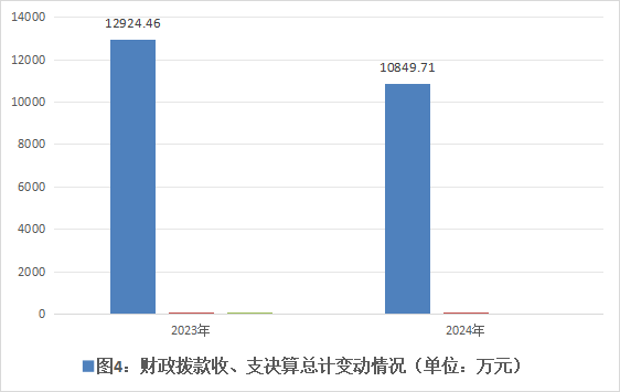 2024年度财政拨款收入、支出总计均为10849.71万元。与2023年度相比,财政拨款收入总计、支出总计各减少2074.75万元,下降16.05%。主要变动原因:一是根据工作部署和规范要求,相关运行经费纳入本级预算;二是政府性基金预算项目支出减少。