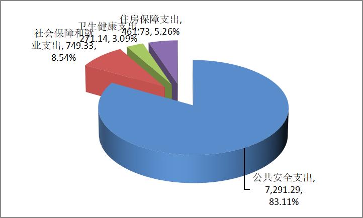 (二)一般公共预算财政拨款支出决算结构情况 2024年一般公共预算财政拨款支出8773.49万元,主要用于以下方面:公共安全支出7291.29万元,占83.11%;社会保障和就业支出749.33万元,占8.54%;卫生健康支出271.14万元,占3.09%;住房保障支出461.73万元,占5.26%。 图6:一般公共预算财政拨款支出决算结构