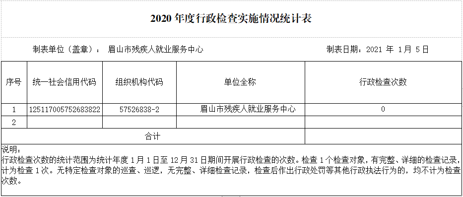 眉山市残疾人就业服务中心2020年度行政检查实施情况统计表