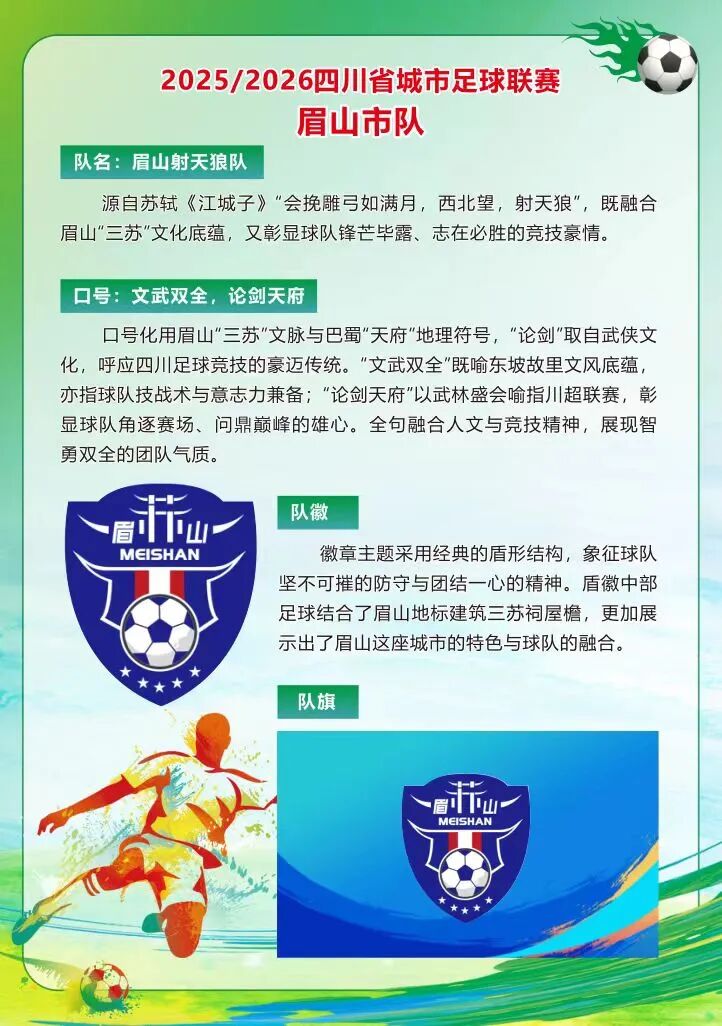025/2026四川银行 四川省城市足球联赛 开赛在即 近日 “川超”眉山队队名、队徽、队旗、口号 正式发布 眉山市队 队名:眉山射天狼队 源自苏轼《江城子》“会挽雕弓如满月,西北望,射天狼”,既融合眉山“三苏”文化底蕴,又彰显球队锋芒毕露、志在必胜的竞技豪情。 口号:文武双全,论剑天府 口号化用眉山“三苏”文脉与巴蜀“天府”地理符号,“论剑”取自武侠文化,呼应四川足球竞技的豪迈传统。“文武双全”既喻东坡故里文风底蕴,亦指球队技战术与意志力兼备;“论剑天府”以武林盛会喻指川超联赛,彰显球队角逐赛场、问鼎巅峰的雄心。全句融合人文与竞技精神,展现智勇双全的团队气质。 队徽 徽章主题采用经典的盾形结构,象征球队坚不可摧的防守与团结一心的精神。盾徽中部足球结合了眉山地标建筑三苏祠屋檐,更加展示出了眉山这座城市的特色与球队的融合。 队旗 让我们一起期待 “川超”眉山射天狼队的 精彩表现吧 |